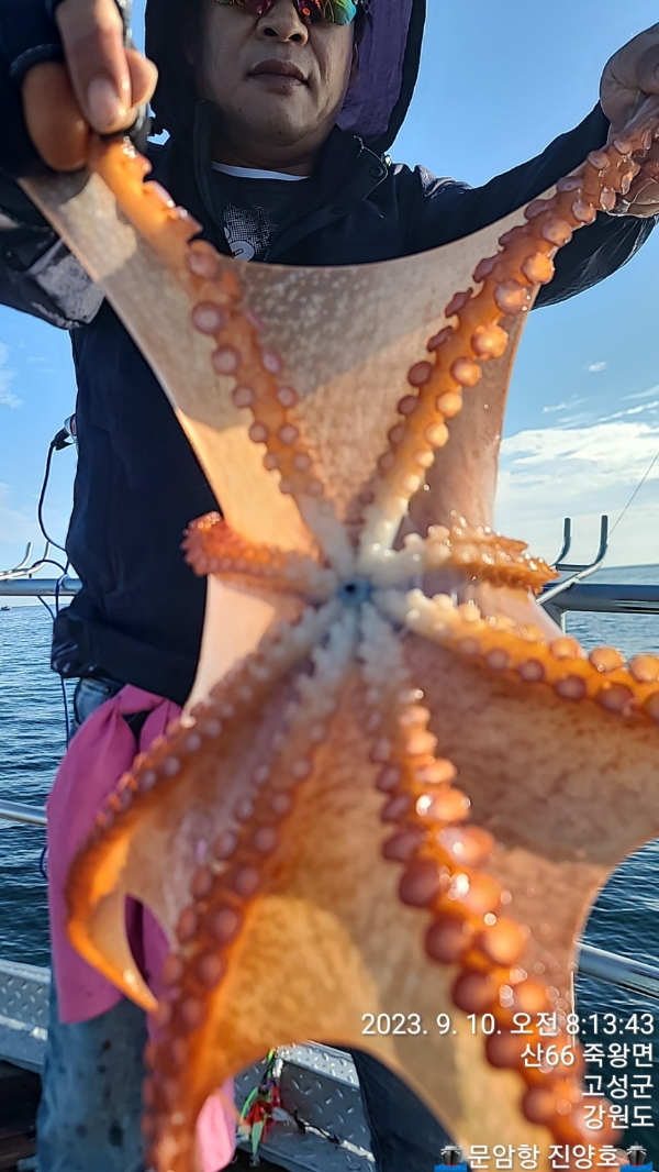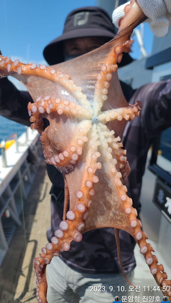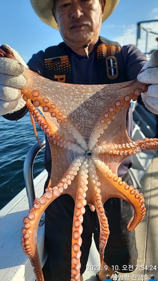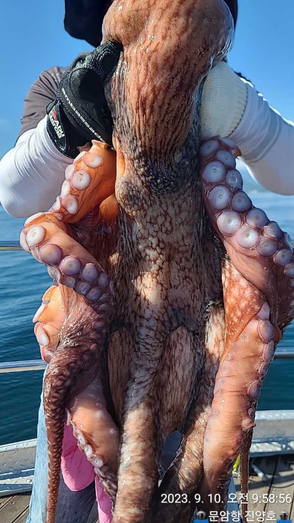 22인승 진양호 오늘 대왕문어가 올라왔습니다. 출조 예약받고 있습니다.